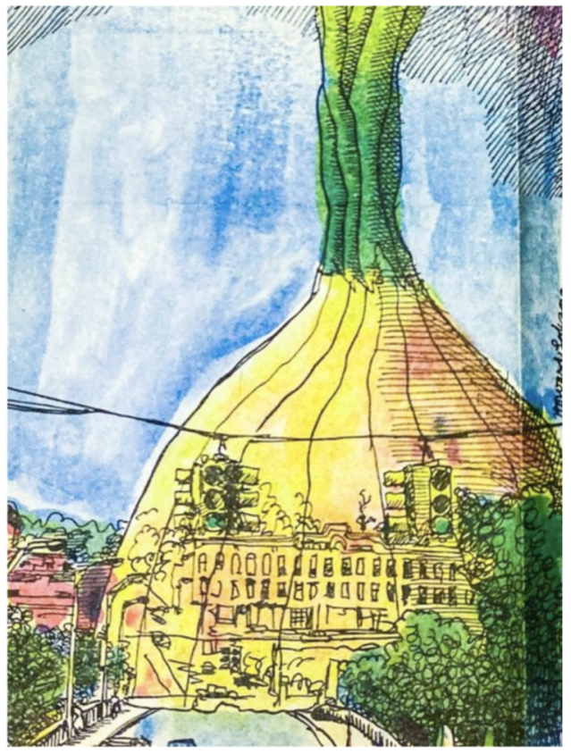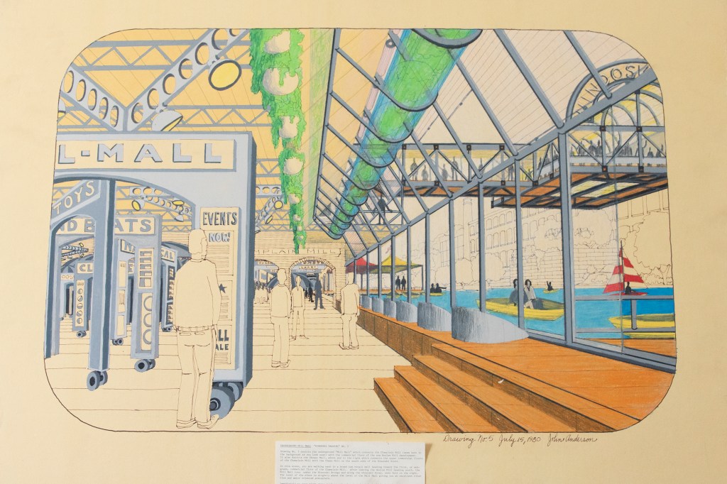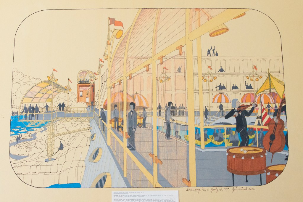 Illustrations of proposed Winooski dome by architect John Anderson, colored pencil on paper, 1979