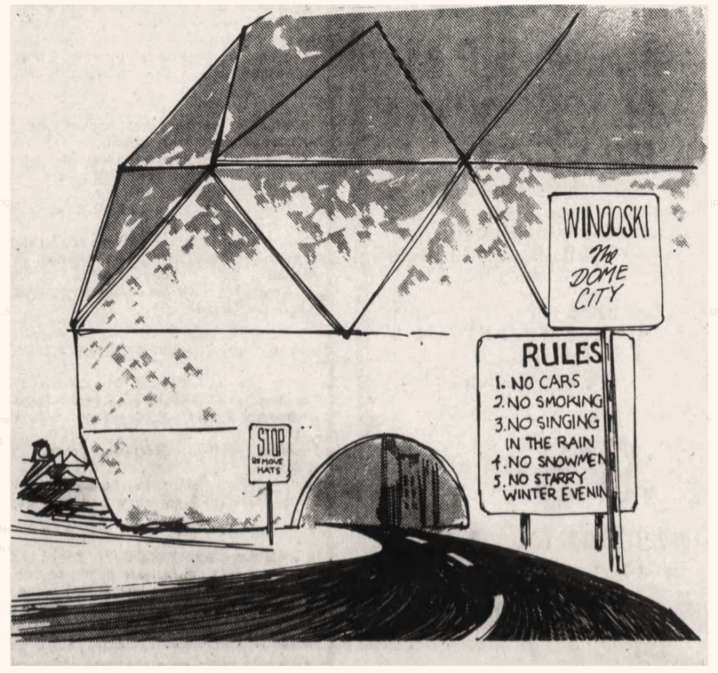 The idea was endorsed by many, including futurist architect R. Buckminster Fuller. Local proponents formed the Golden Onion Dome Club to drum up support, proudly noting that “Winooski” comes from the Abenaki word for wild onion — a fitting symbol for a city being kept fresh in a Tupperware container. Skeptics, meanwhile, worried about the practicality of maintaining a giant cover and whether residents would slowly cook like a communal casserole.